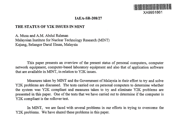 To prevent the millennium bug, the pepijat alaf, from destroying society, the entirety of Malaysia was galvanised to action. A National Y2K Committee was formed, with representatives from key portfolios such as Transport, Water, Health, and Telecommunications. The media constantly reported the dangers of Y2K, with op-ed after op-ed decrying the lack of awareness and complacency in Malaysians that would inevitably lead to catastrophe. Many companies appointed Y2K Heads, crafted contingency plans, and overhauled their IT infrastructure as best they could. In the financial industry, the Securities Commission mandated that all public listed companies were to undergo Y2K training, reviews, and announce their efforts to the public. Borrowers and investors were advised to mitigate their risk by diverting their money to Y2K compliant companies. Among financial institutions regulated by the central bank alone, a whopping 585 million ringgit had been spent to prepare for the looming cyber-disaster. Each industry went through a similar process, with hundreds of man hours, and millions of ringgit spent to become “Y2K Ready”.